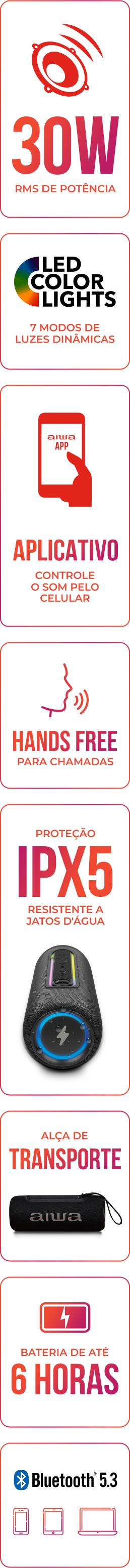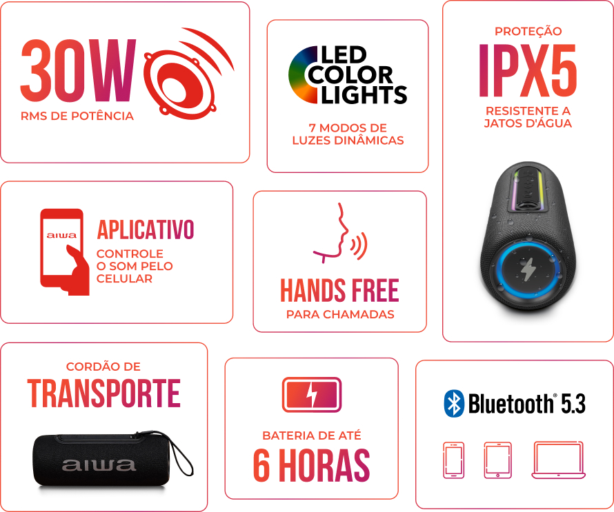 Prática e versátil, esta caixa de som portátil da Aiwa conta com função hands-free, com microfone embutido que permite atender chamadas telefônicas diretamente pelo speaker.